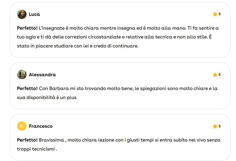 Contattami per una prima chiacchierata: parliamo dei tuoi obiettivi e troviamo il percorso più adatto a te. Inoltre, potrai sperimentare il mio metodo d'insegnamento, la prima lezione è completamente gratuita!